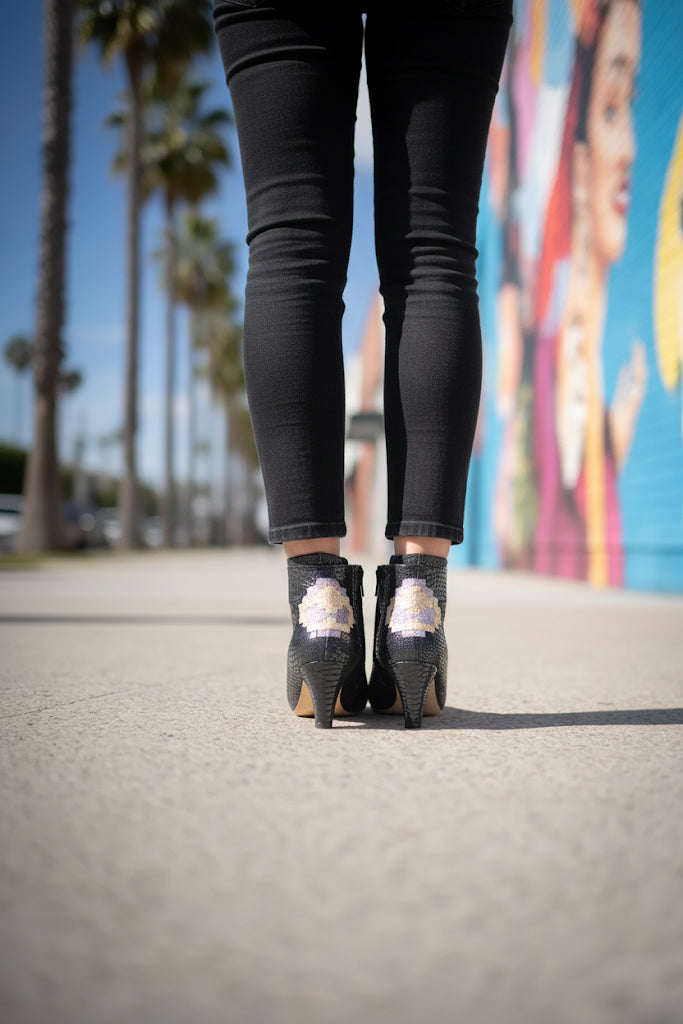 • Black metallic printed nubuck, Champagne and gray glitter details