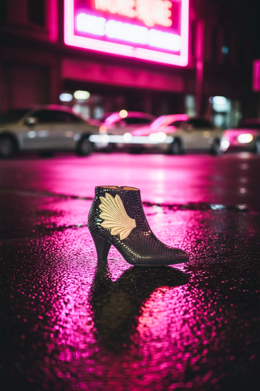 Here comes Hooping. An ankle boot that doesn’t walk, it floats above the pavement, like Norville Barnes in slow motion in The Hudsucker Proxy. A 5.5 cm heel, a clean arch, and a golden wing embroidered on the side, as if you were about to invent something as brilliant as the hula hoop. But better: a silhouette that orbits somewhere between retro elegance, playful irony, and intergalactic energy. Hooping is a statement of intent. You refuse the grey, the ordinary, the straight line. You choose the circle, the movement, the poetry of a gesture both free and dazzling. A boot for girls who dream in CinemaScope, who believe the absurd is a strength, and that style — when done right — can change the course of a day.