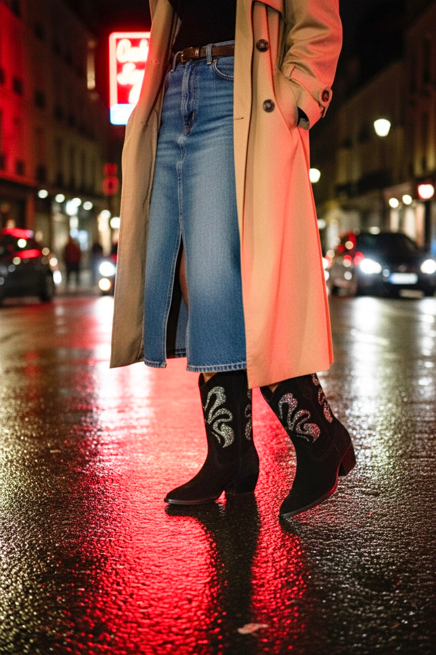 Here comes Jodo. A western boot? Yes. But above all, an initiation. A call to leap. A plunge, feet first, into the psychomagic of style. Because Jodo isn’t just a shoe — it’s a vision. With its glittering flame patterns, this boot feels like it escaped straight from one of Alejandro Jodorowsky’s dreams: an unmade film, a metaphysical odyssey through the desert, somewhere between tarot and futuristic western. The leather catches the light like a prophecy. The 5 cm heel gives the perfect lift — not too much, not too little — just enough to stride toward your destiny without stumbling. Jodo is for those who dare. Those who know that every step can be a performance. A healing. A love letter to their own extravagance. Why Jodo? Because behind every Patricia Blanchet pair, there’s a story. And sometimes, that story begins with a spark of glitter and ends in illumination.