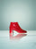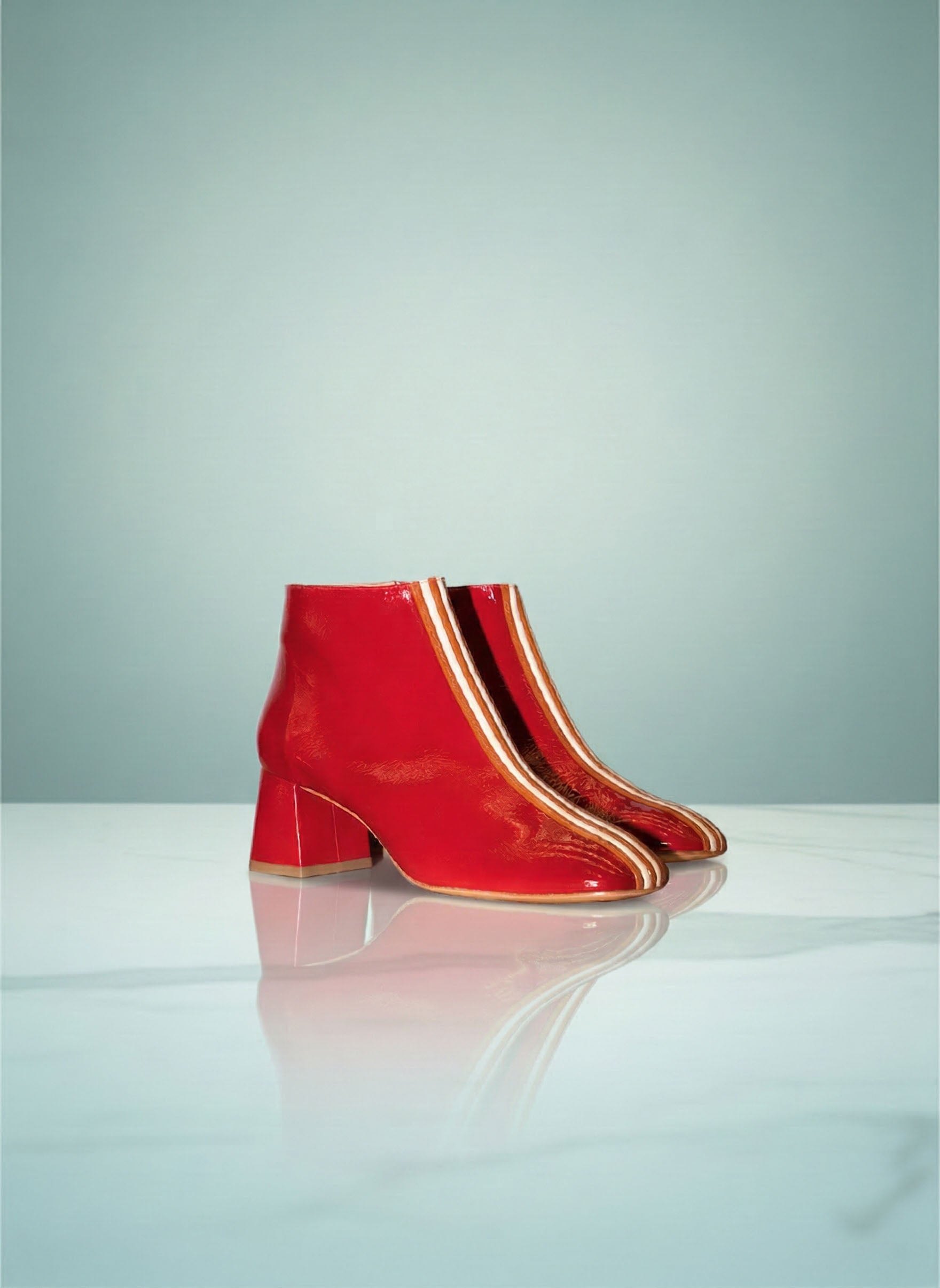 • Crinkled patent leather in lipstick red with cognac and ivory details