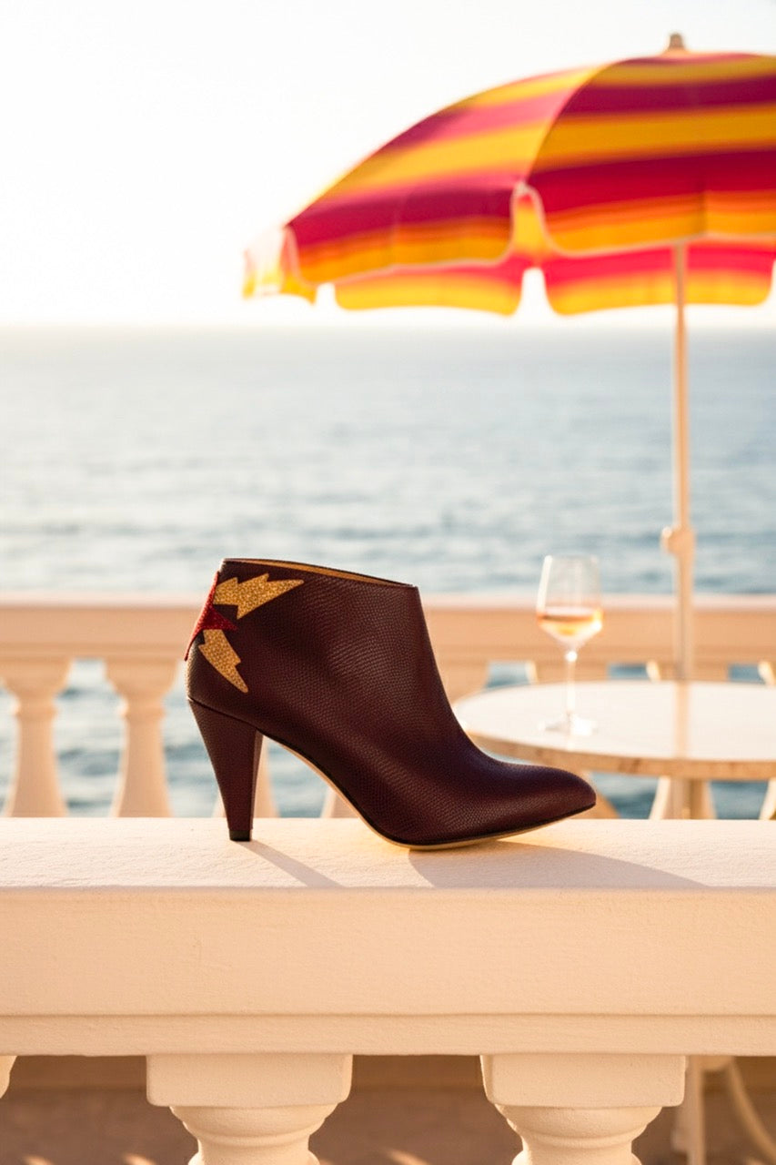 • Nubuck imprimé métallisé prune, Détail glitter fin champagne et rouge