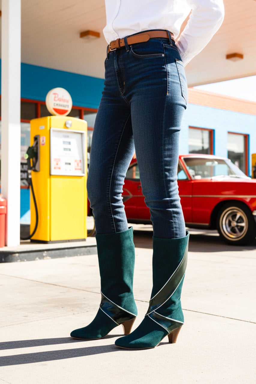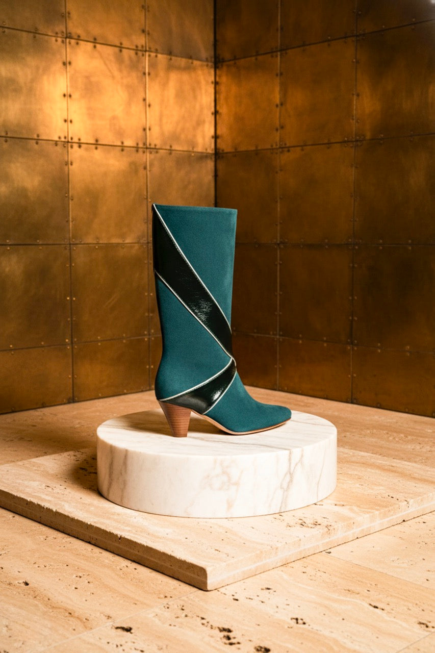 • Nubuck et cuir verni vert forêt, Liseré nubuck métallisé champagne