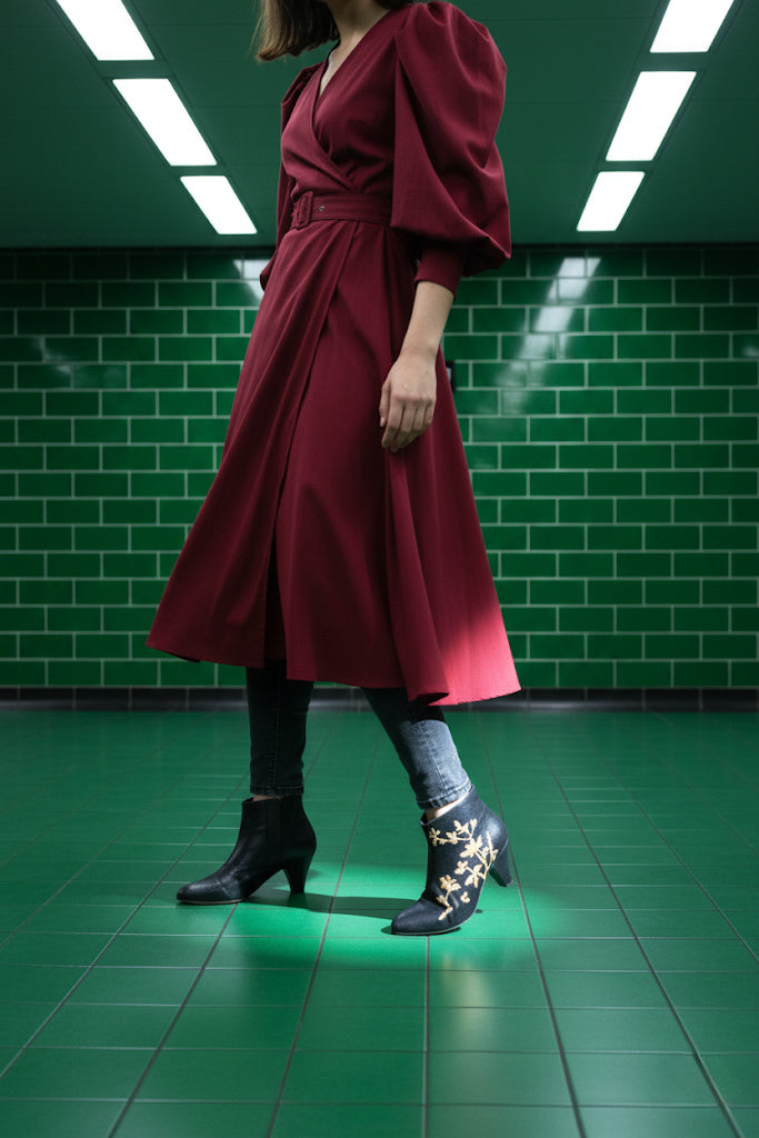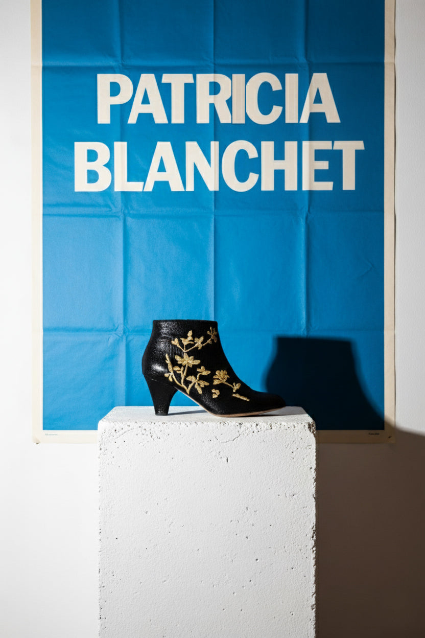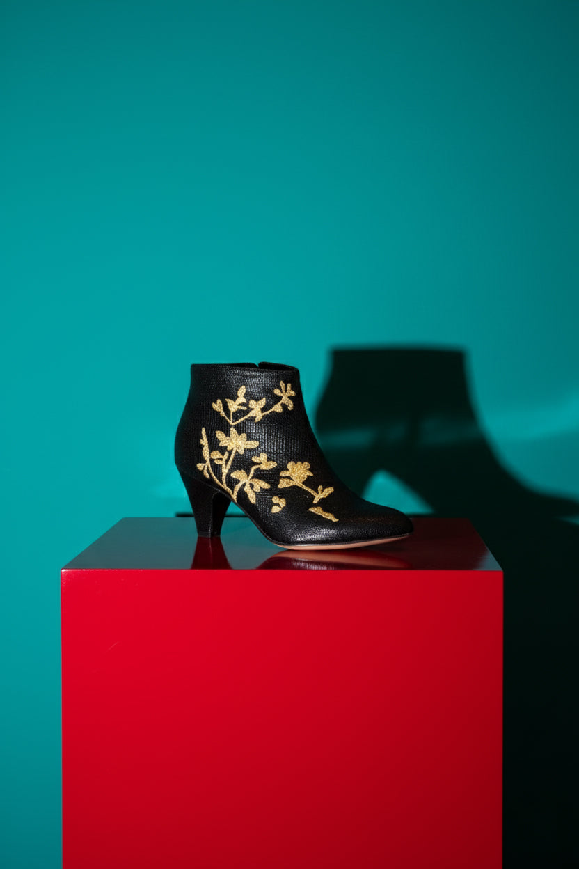 Voici Colbert, bottine pour femmes au sens aigu de la répartie. Un modèle qui ne baisse jamais les yeux, même face à un costume trois pièces. Colbert, c’est le charme discret de l’intelligence. Un noir profond texturé, relevé d’une broderie florale dorée, comme une réplique fine balancée en pleine lumière. Le talon de 5,5 centimètre assure l’équilibre parfait entre aplomb et confort — suffisamment haut pour vous faire remarquer, assez stable pour ne jamais vaciller, même sous les projecteurs. Cette bottine rend hommage à Stephen Colbert, maître incontesté du verbe et de l’élégance sarcastique. Comme lui, elle manie les symboles avec grâce, distille des vérités dans un éclat de rire et avance toujours d’un pas assuré. Avec Colbert, vous ne marchez pas. Vous citez. Vous argumentez. Vous triomphez.