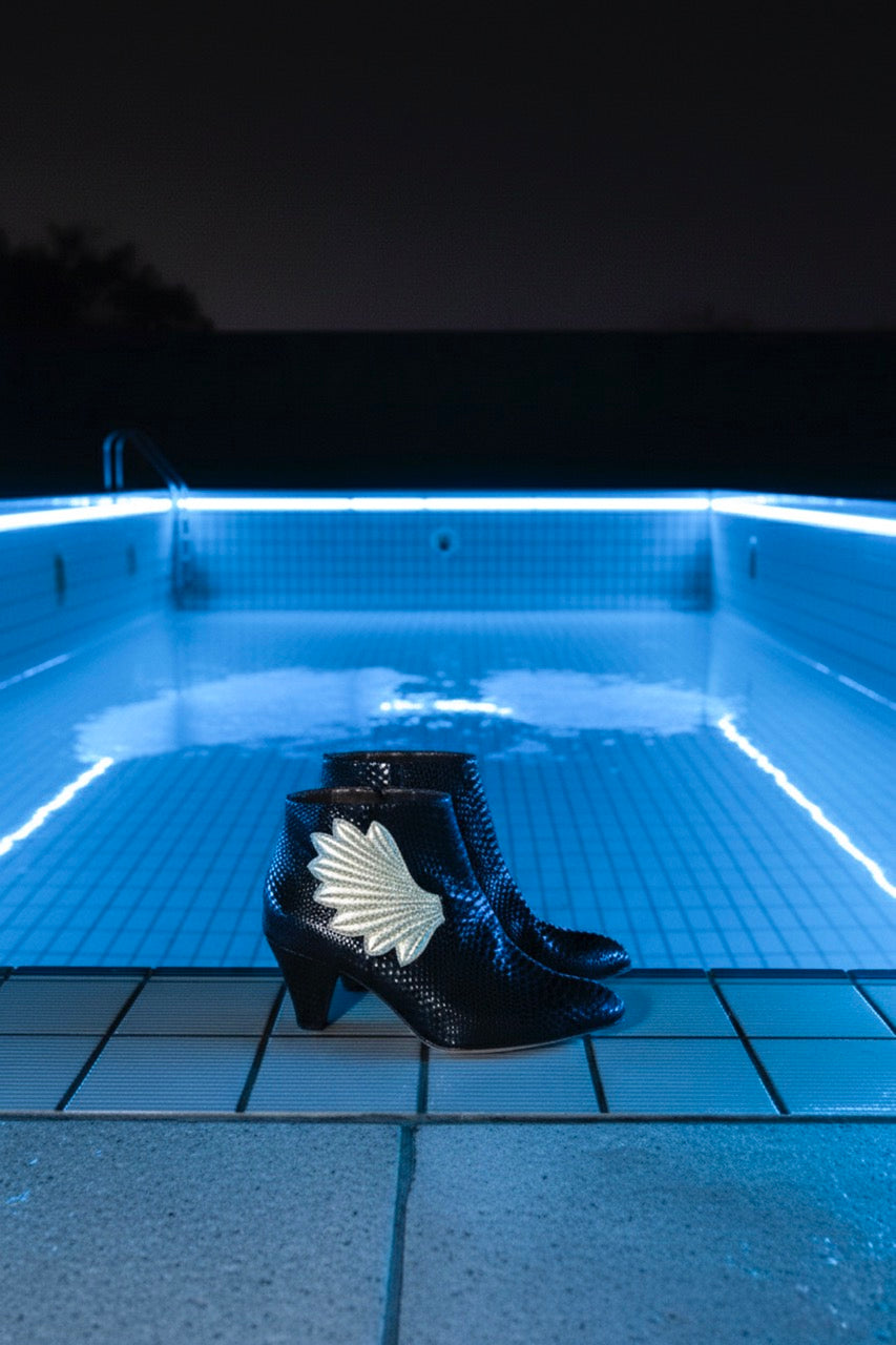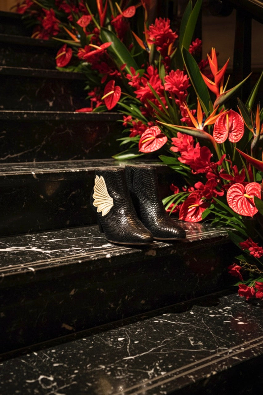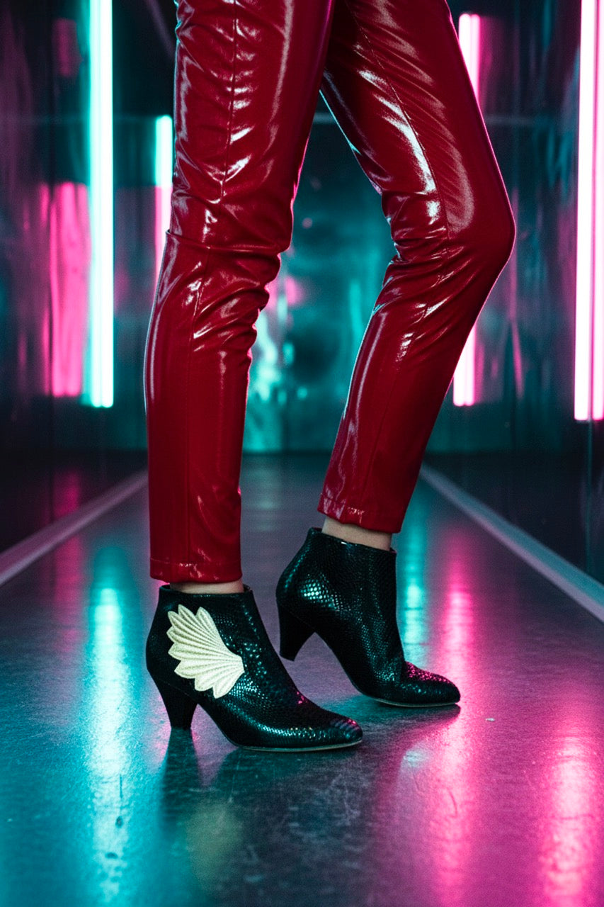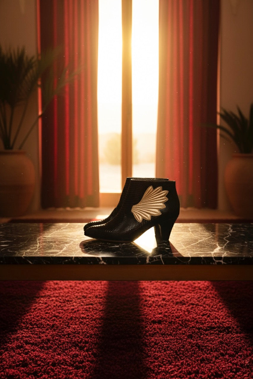 Voici Hooping. Une bottine qui ne marche pas : elle flotte au-dessus du bitume, comme Norville Barnes au ralenti dans Le Grand Saut. Talon 5,5 cm, cambrure nette, et une aile dorée brodée sur le côté — comme si tu t’apprêtais à inventer quelque chose d’aussi génial qu’un hula-hoop. Mais en mieux : une allure qui gravite entre élégance rétro, second degré maîtrisé et énergie intergalactique. Hooping, c’est une déclaration d’intention. Tu refuses le gris, le banal, le linéaire. Tu choisis le cercle, le mouvement, la poésie du geste gratuit et brillant. Une bottine pour les filles qui rêvent en cinémascope, qui pensent que l’absurde est une force, et que le style, quand il est bien fait, peut changer le cours d’une journée.