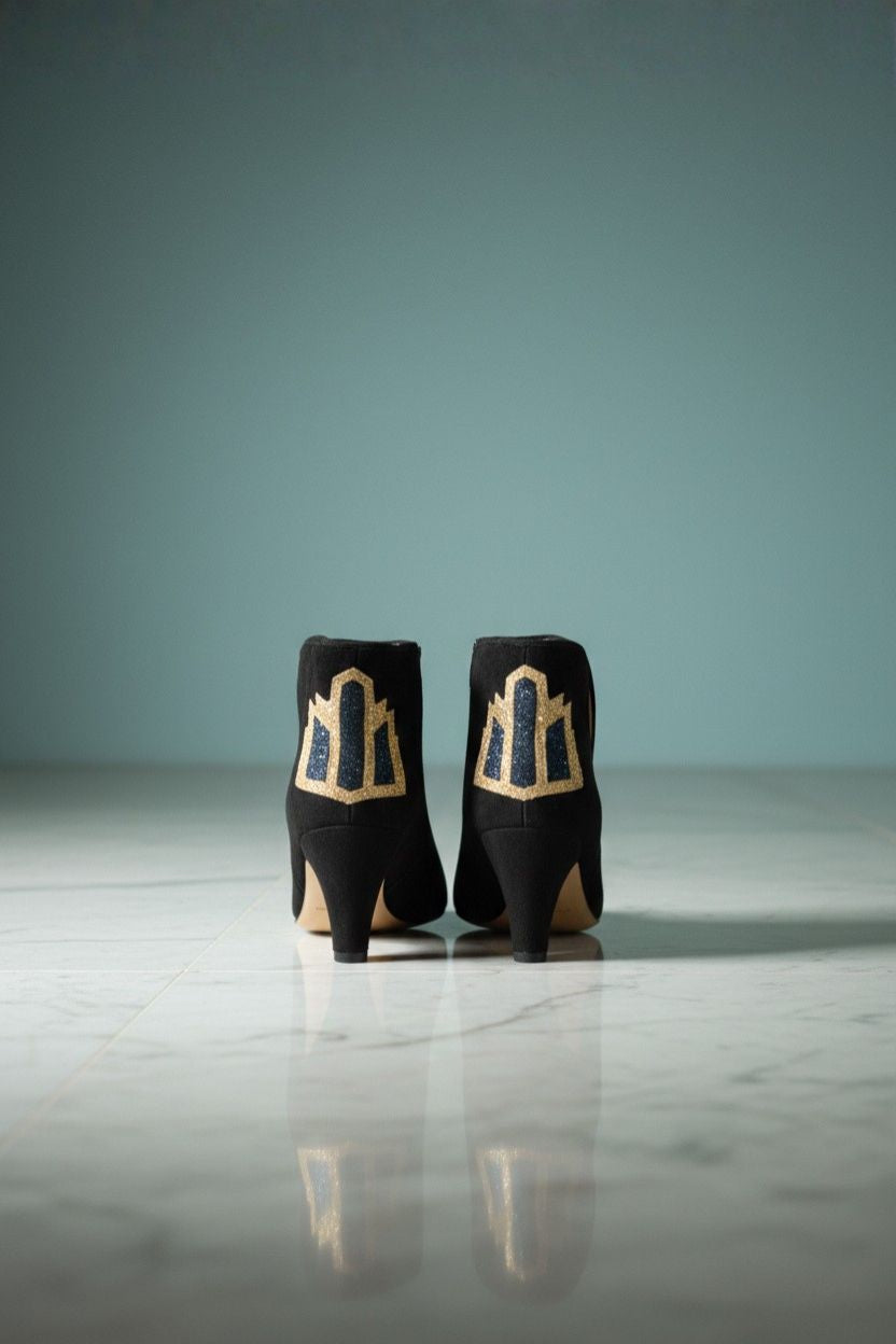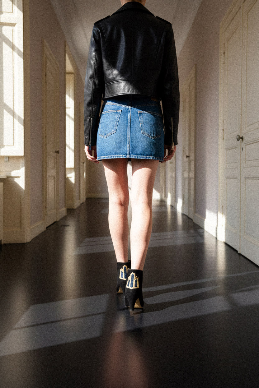 JasonLee est née d’un regard de cinéma et d’un refus de rentrer dans le rang. Son nom rend hommage à Jennifer Jason Leigh dans Le Grand Saut, une femme qui n’attend rien de personne et qui rafle tout sans demander pardon. La bottine en a gardé l’esprit : une silhouette nette, noire, élégante sans mièvrerie. Son talon de 5,5 cm a été pensé pour celles qui veulent de l’allure sans se fatiguer à jouer les héroïnes tragiques : il élance, il porte, il accompagne la vraie vie. À l’arrière, un écusson graphique scintillant reprend le symbole d’une organisation secrète féministe et lesbienne, née dans l’underground, quand certaines femmes s’organisaient dans l’ombre pour vivre libres au grand jour. Un signe discret, presque un mot de passe, glissé là pour celles qui reconnaissent la force des histoires qu’on ne raconte pas toujours. JasonLee traverse les saisons sans s’user, avec ce mélange de rétro et de modernité qui ne cherche pas à plaire mais finit toujours par séduire. Une bottine pour marcher droit, avancer vite, et ne jamais s’excuser d’être soi.