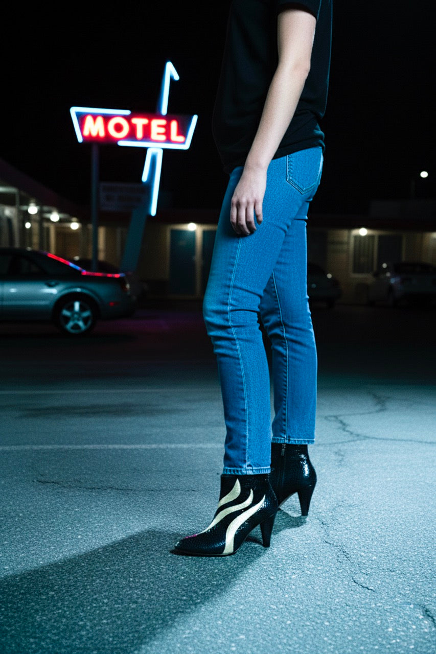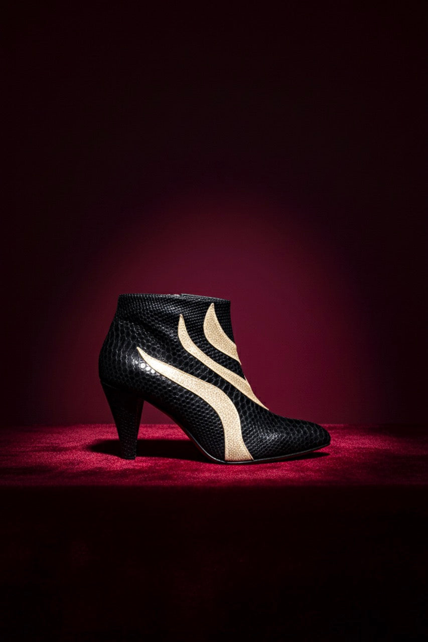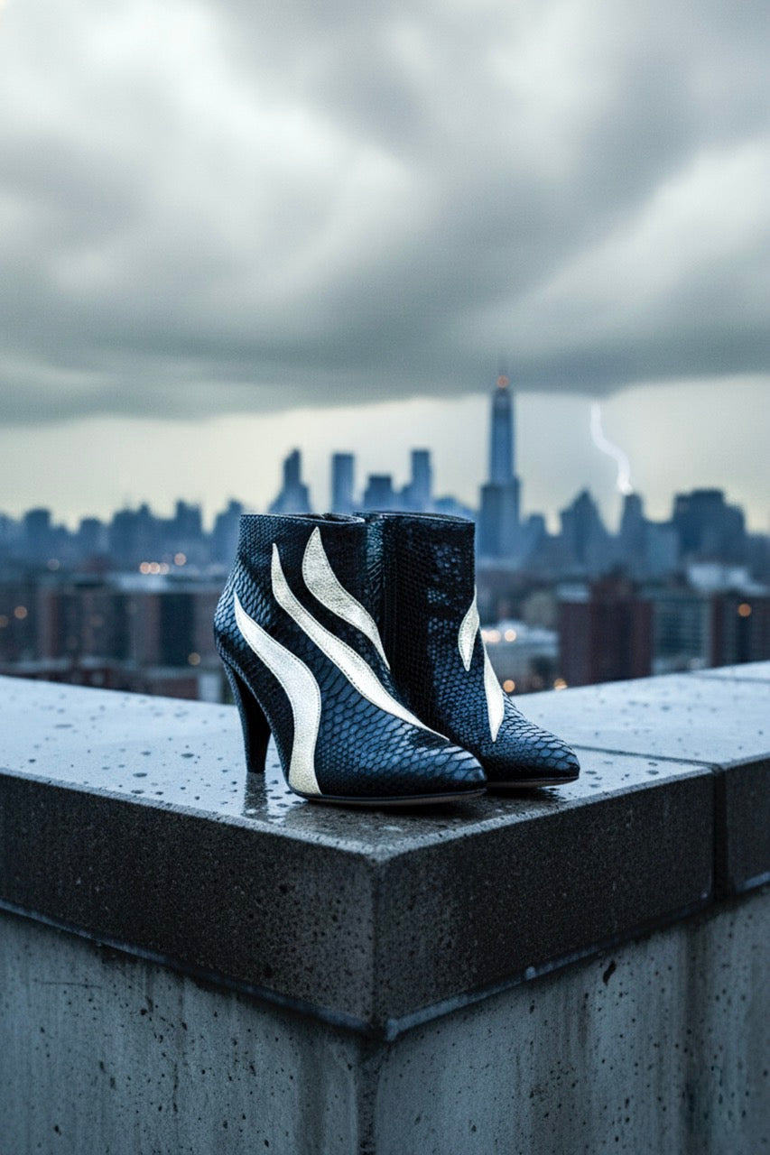 Kershner est une bottine comme un générique de fin en lettres de feu. Un modèle cinématographique, sculpté dans le suspense, animé par la tension et le style. Talon de 7 centimètres, cambrure parfaite, et lignes flammes qui ondulent en contraste brillant sur matière profonde. Une allure dramatique, quasi opératique. Son nom ? Un hommage vibrant à Irvin Kershner, réalisateur de "L’Empire contre-attaque", artisan de la tension élégante, du récit puissant et sensuel( comme moi). Kershner, c’est cette bottine qui ne choisit pas entre l’audace et le contrôle. Elle embrase la silhouette, et laisse derrière elle une traînée de mystère. À porter comme un manifeste. Ou comme une arme de séduction silencieuse. Kershner, c’est le feu qui prend dans le noir.