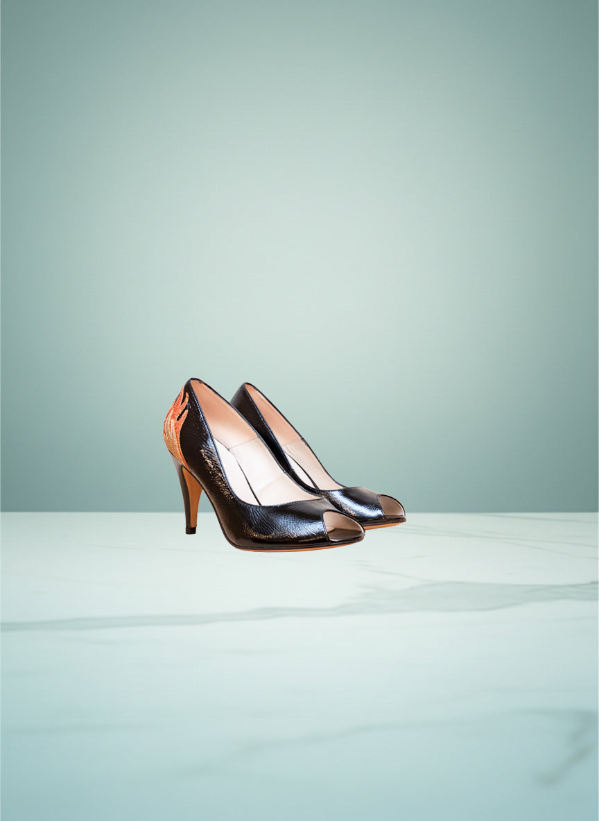 • Cuir verni froissé en noir avec détail métallisé doré et cuivré